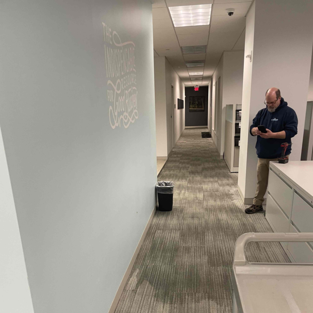During construction on the 9th floor, a contractor accidentally struck a fire extinguishing water pipe system. This caused water to spread from the 8th floor down to the 2nd floor, affecting multiple offices, lobby areas, and businesses within the shared building. County Action Restoration was called in to perform emergency mitigation and cleanup. However, the restoration process itself was outside the scope of our work.